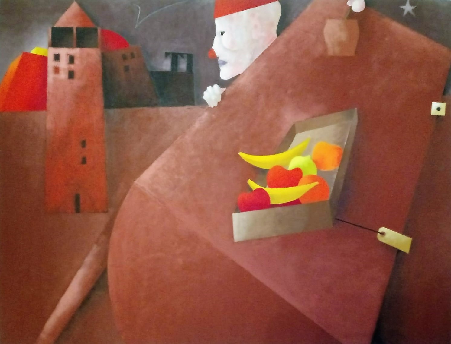 Emilio Tadini (Milano, 1927 – Milano, 2002) "Profugo" 1985 acrilico su tela cm 89x116 firmato e titolato al verso autentica su foto dello Studio Marconi, Milano