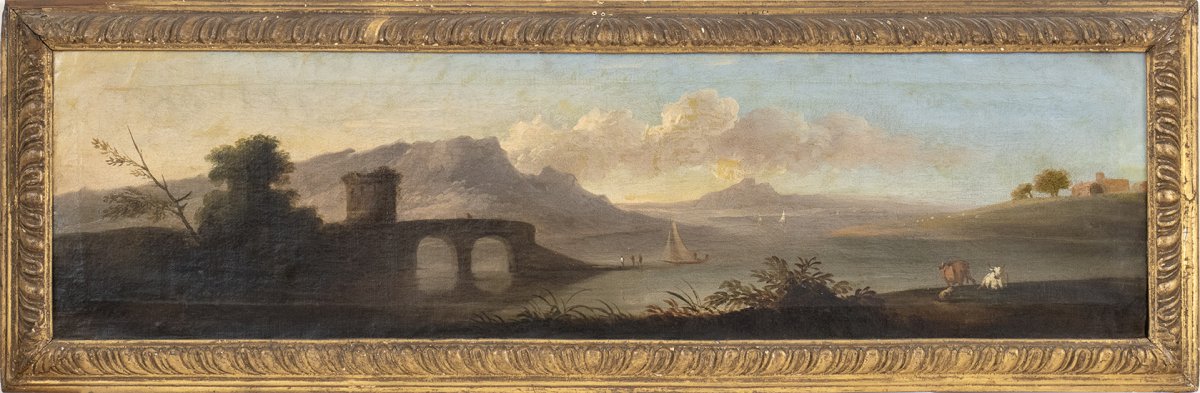 Paesaggio con ponte, torre cilindrica, corso d'acqua e figure