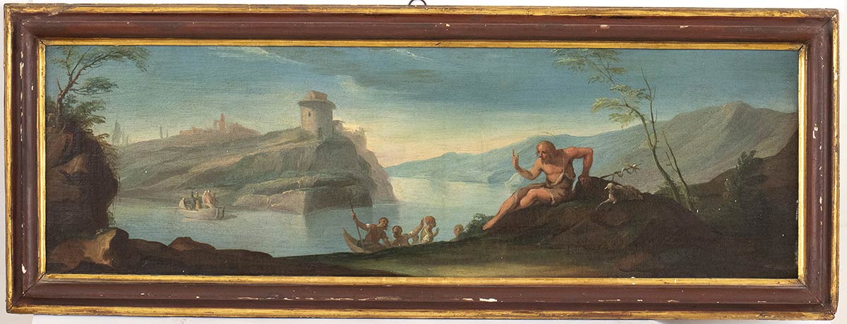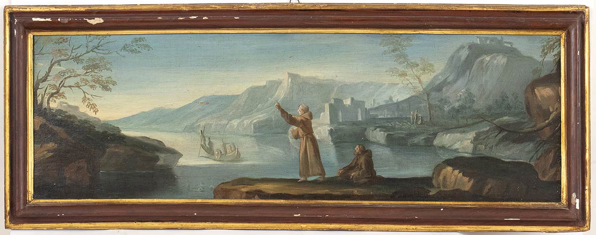 Scena costiera con San Giovanni Battista e barche di pescatori sullo sfondo - Scena costiera con San Francesco e frate Leone e barca con pescatori sullo sfondo. Coppia di dipinti sovraporta