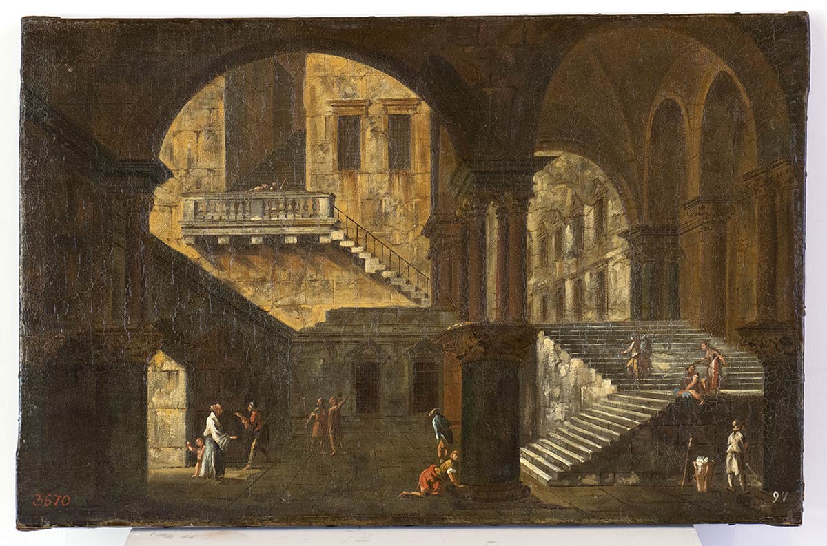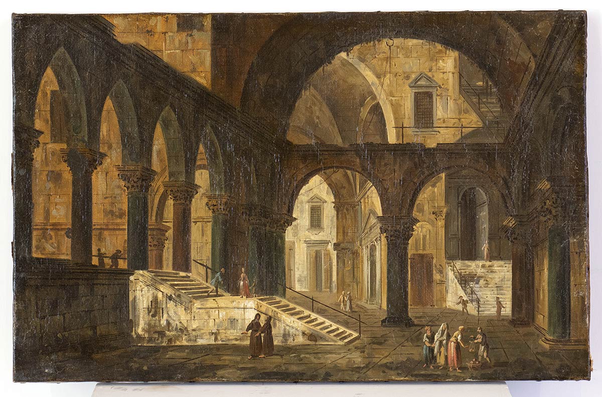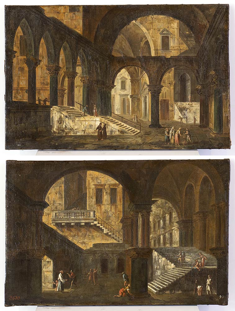 Coppia di interni architettonici con figure