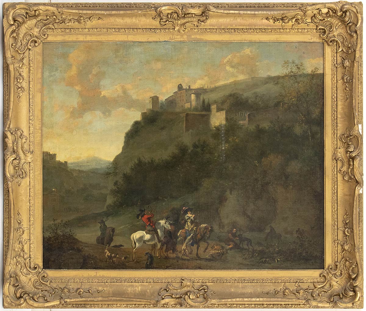 Lotto 147 | Grande paesaggio con cavalieri in primo piano e borgo sullo sfondo