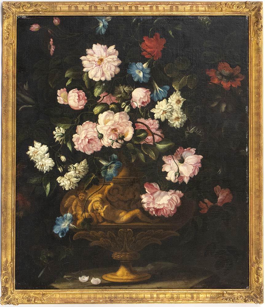 Lotto 148 | Bouquet di fiori in un vaso metallico istoriato