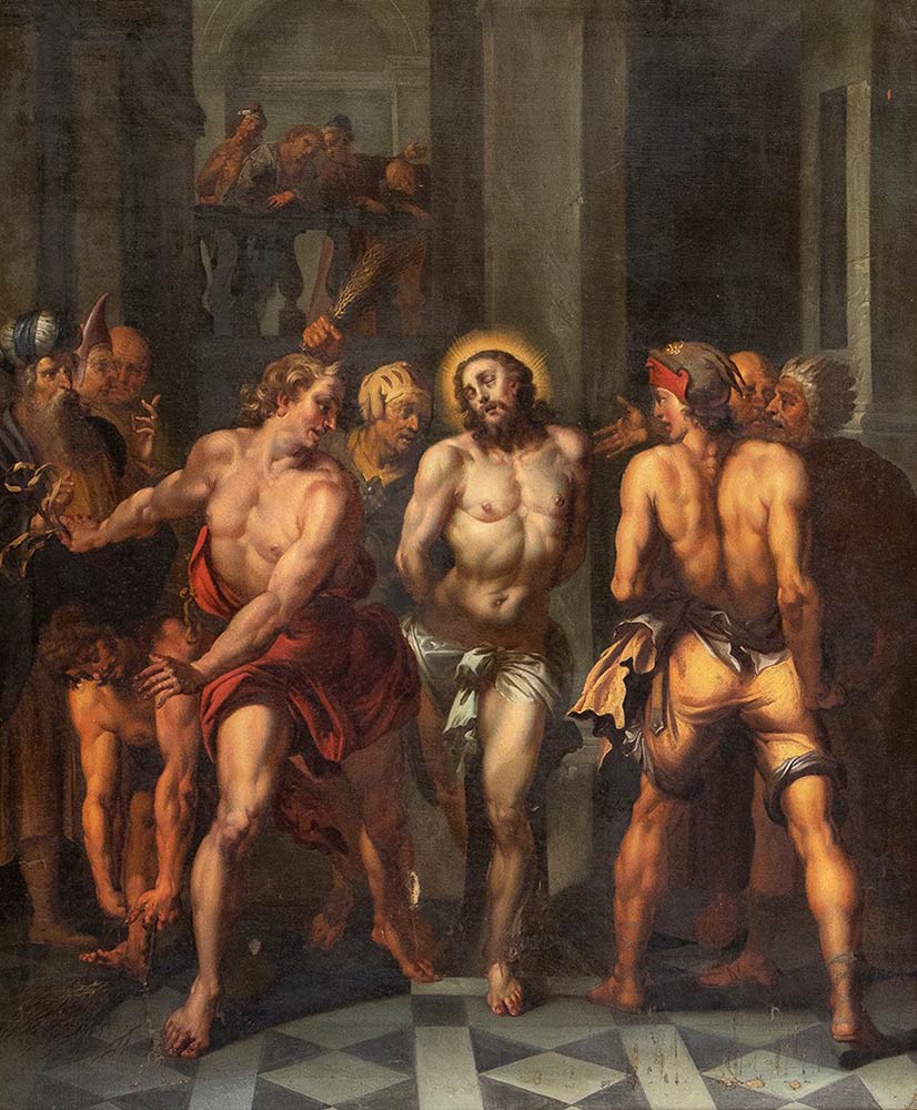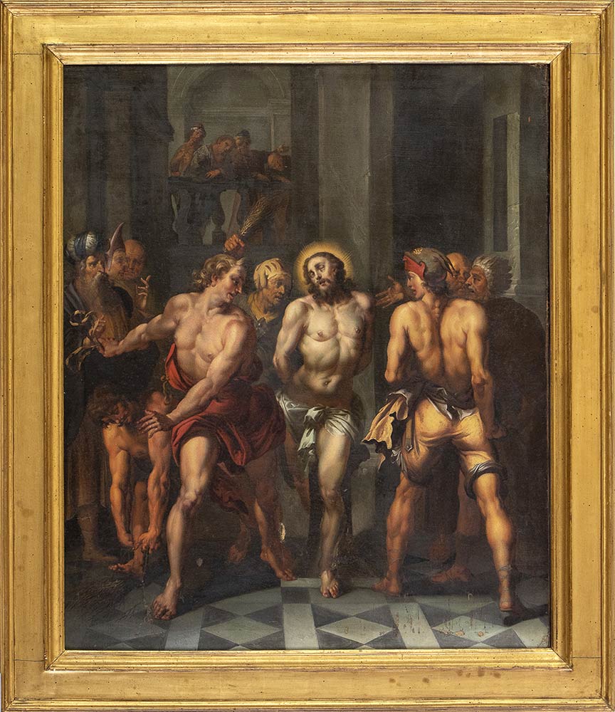La tela qui in oggetto presenta una chiara connessione con una celebre incisione di Jan Sadeler, in tutto simile dal punto di vista compositivo. Il lungo cartiglio posto alla base dell'incisione presenta al centro lo stemma del cardinale Giulio Antonio Santori accompagnato da un'iscrizione che recita: "ARPINAS PICTOR QUOD DICAT ARTIS OPUS / 1593". Il contenuto dell'iscrizione viene confermato da Giovanni Baglione nelle sue "Vite de' Pittori, Scultori et Architetti", quando nella biografia dedicata al Sadeler segnala fra le opere di quest'ultimo "il Christo flagellato alla colonna del Cavalier D'Arpino". Al Dipartimento di Arti Grafiche del Louvre è inoltre conservato un disegno che costituisce chiaramente uno studio preparatorio per lo scherano posto alla sinistra di Cristo nella nostra tela. Analogie nell'impianto compositivo sono rilevabili anche con un disegno del Cavalier d'Arpino, sempre raffigurante il Cristo alla colonna, oggi presso il Courtauld Institute di Londra.Come rileva opportunamente Guendalina Serafinelli nello studio critico che accompagna il dipinto, l'Arpino rimedita qui due testi chiavi della pittura romana del Cinquecento, la Flagellazione di Cristo eseguita da Sebastiano del Piombo su disegno di Michelangelo nella cappella Borgherini a San Pietro in Montorio e quella dipinta da Federico Zuccari per l'Oratorio del Gonfalone nel 1573. Nell'ultimo decennio del XVI secolo, epoca in cui il dipinto fu eseguito, Giuseppe Cesari e suo fratello Bernardino vivevano presso l'abitazione del Cardinale Santori, il quale commissionò loro due affreschi nella chiesa dio Sant'Atanasio dei Greci: ciò che spiega la dedica al cardinale dell'incisione del Sadeler e del dipinto da cui essa è tratta.