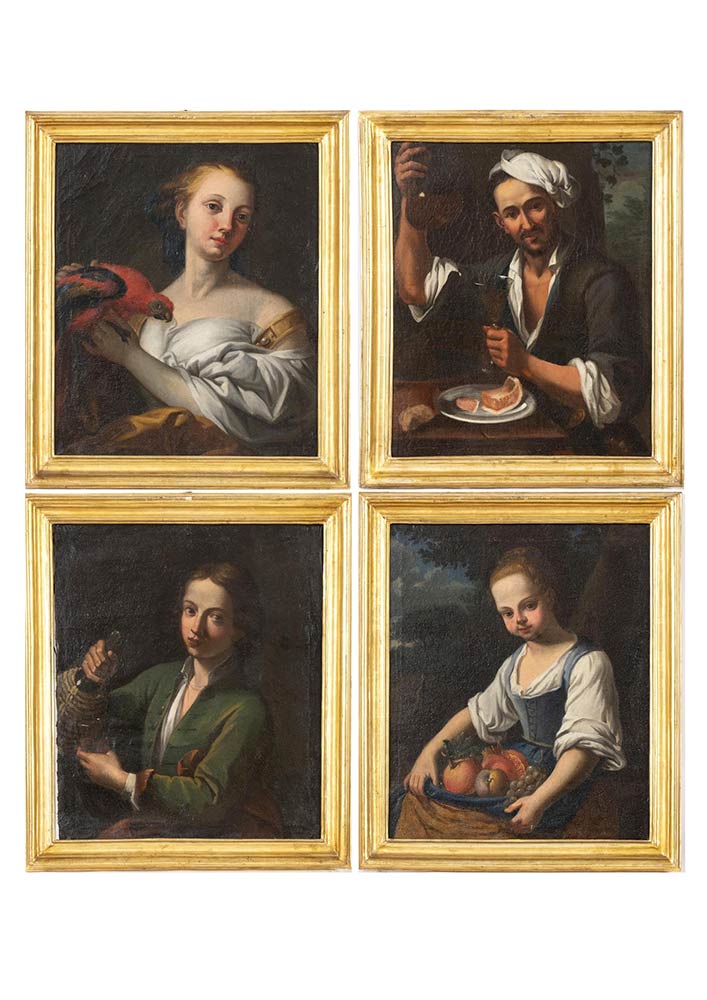 A) Giovinetta con pappagallo; B) Oste con caraffa e bicchiere di vino bianco; C) Giovane con fiasco e bicchiere di vino; D) Fanciulla con frutta. Serie di quattro dipinti