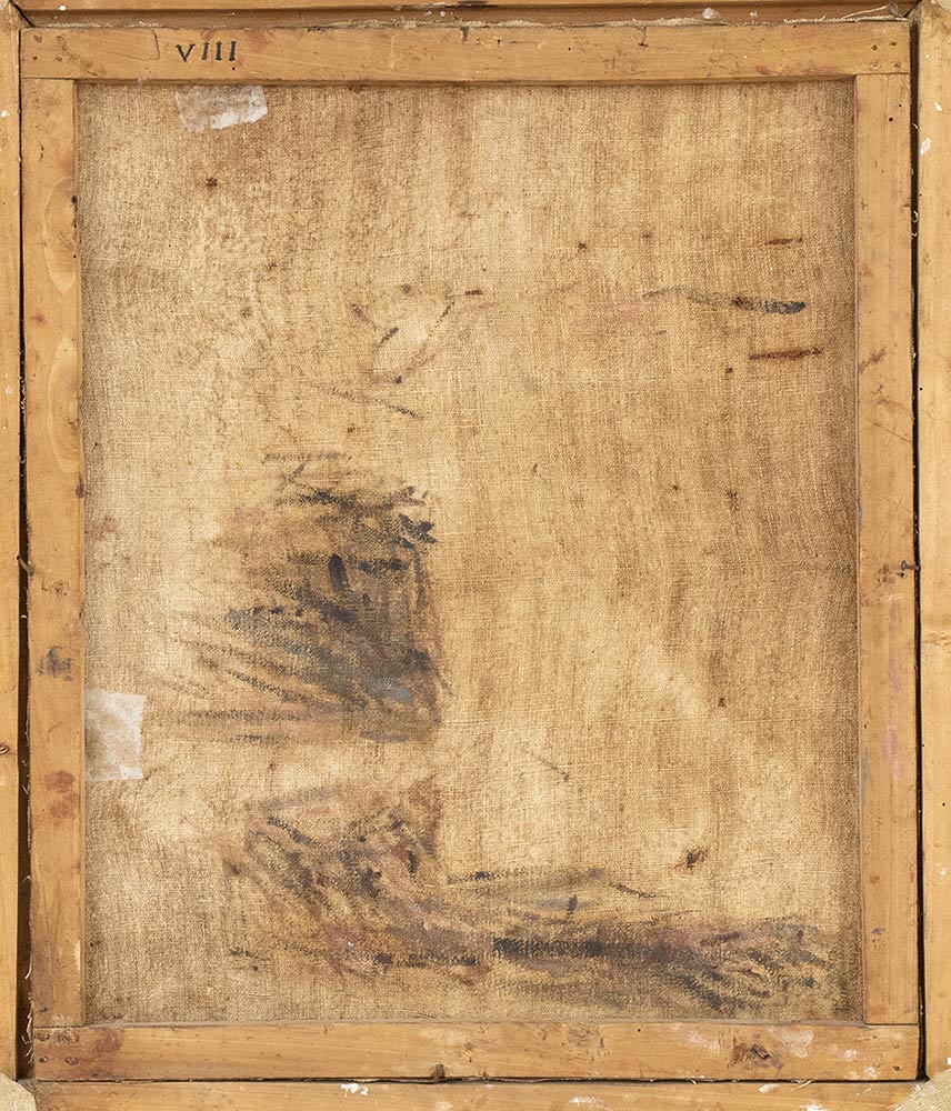 Gruppo di quattro tele parte di una serie di otto. Il primo gruppo con i precedenti quattro numeri viene offerto in vendita al lotto precedente. Al retro sulla cornice e sul telaio recano numero progressivo a pennello da V A VIII (vedi lotto precedente).