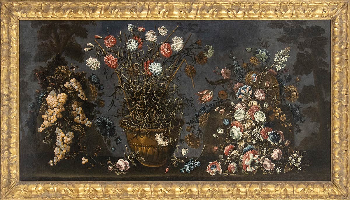 Grande natura morta con vaso, composizioni floreali e grappoli d'uva en plein air