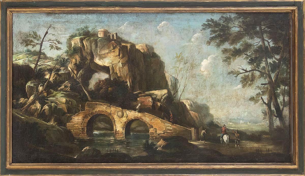 Paesaggio con ponte e viandanti