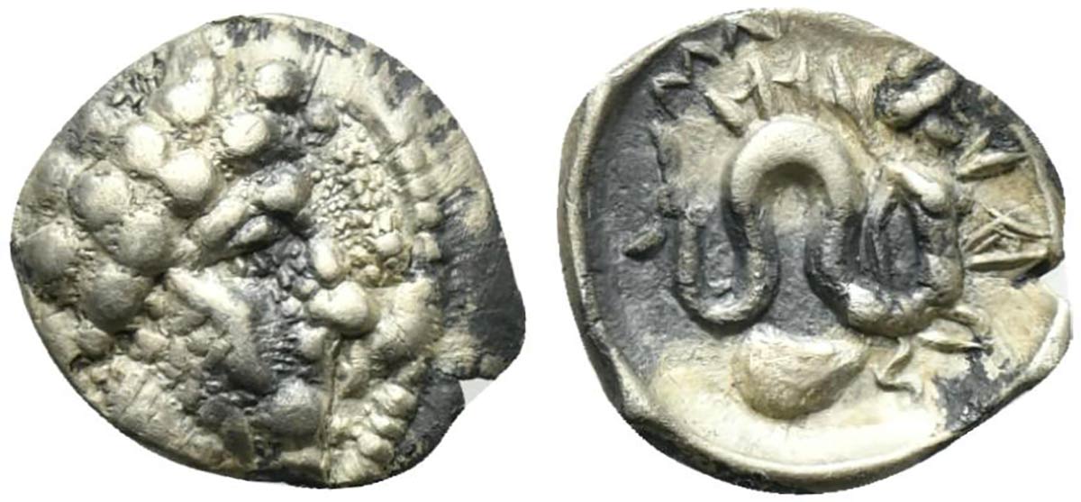 Campania, Allifae, Obol, ca. 325-275 BC; AR (g 0,63; mm 11; h 6); Laureate head of Apollo r.; around, three dolphins, Rv. AΛΛIBANON, Skylla swimming r.; below, mussel. HNItaly 460.