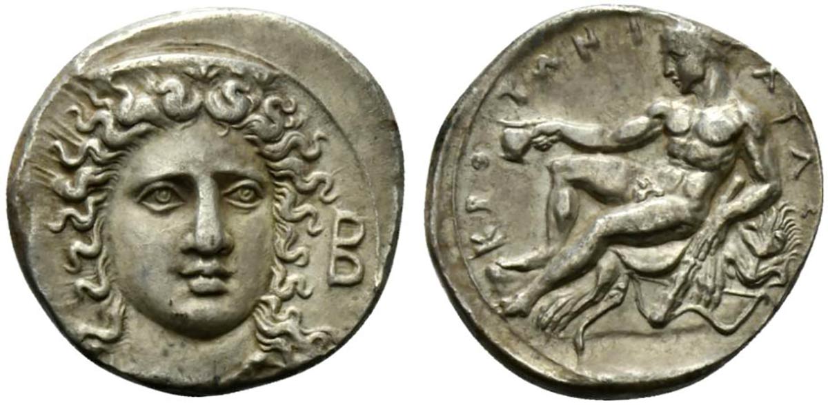 Bruttium, Croton, Stater, ca. 400-325 BC; AR (g 8,08; mm 22; h 9); Facing head of Hera Lakinia, slightly r., on r., B, Rv. KPOTΩNIATAΣ, Herakles seated l. on rock, covered by lion’s skin, holding cup, club and bow. HNItaly 2169; SNG Copenhagen 1802-1803; SNG ANS 375.