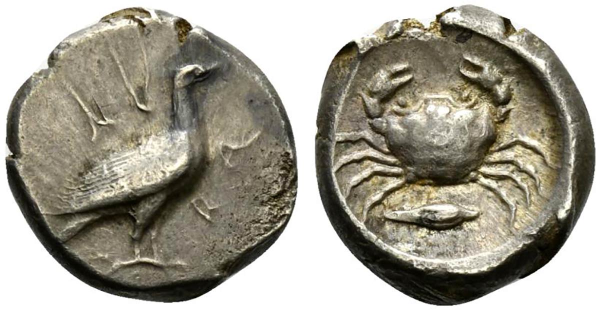 Sicily, Akragas, Didrachm, ca. 480-470 BC; AR (g 8,62; mm 19; h 1); AK - RA, eagle standing r., Rv. crab; below barley grain; all within incuse circle. Westermark 261.5 (O87/R180).