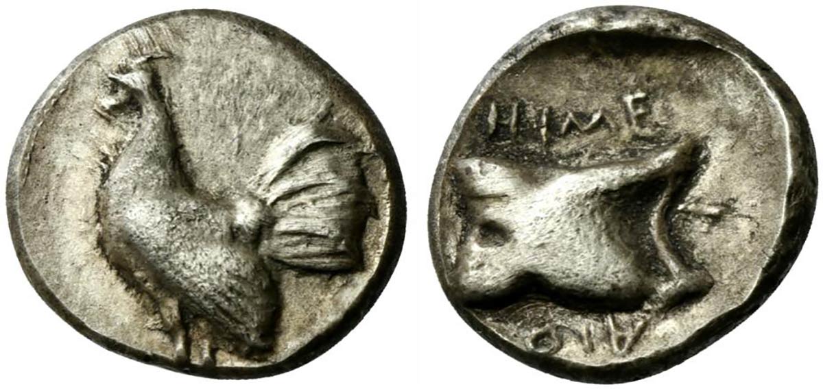 Sicily, Himera, Drachm, ca. 475-470 BC; AR (g 4,28; mm 16; h 12); Cock standing l., Rv. HIME - P - AION, astragalus. SNG Lloyd 1015; Westermark, Himera: the coins of Akragantine type, Traveaux Le Rider, 127; HGC 2, 441.