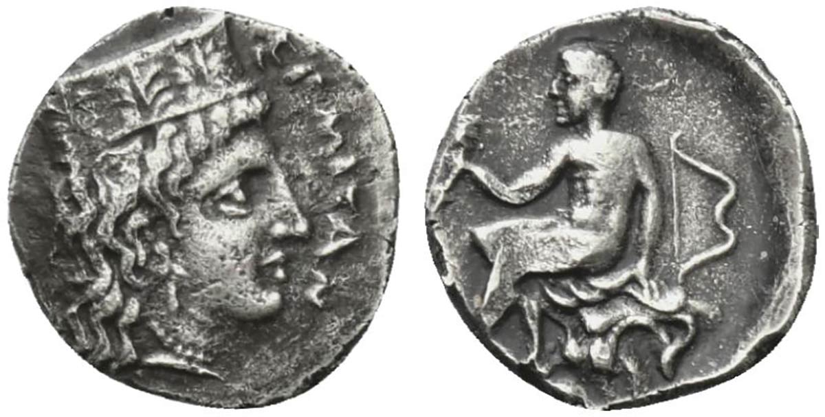Sicily, Himera as Thermai Himerensis, Litra, 4th century BC; AR (g 0,90; mm 11; h 6); ΘEPMITAN, head of Hera r., wearing stephane decorated with three palmettes, Rv. Herakles, seated l. on a rock draped with a lion's skin, with a club; behind, bow. Campana 2A; Jenkins, Punic pl. 22, 7 var (denomination); SNG ANS 1341.