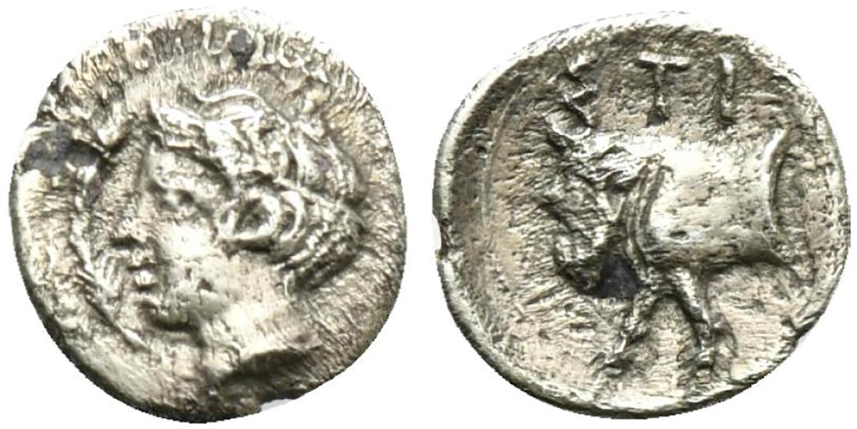 Sicily, Stiela, Hemilitron, ca. 415-400 BC; AR (g 0,37; mm 8; h 9); Head of a...