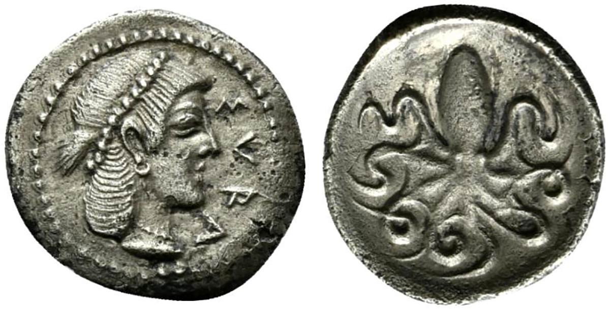 Sicily, Syracuse, Litra struck under the Second Democracy, ca. 466-460 BC; AR (g 0,77; mm 12; h 9); Head of Arethusa r., wearing earring, necklace and pearl diadem; before, ΣYRA, Rv. Octopus. Boehringer Series XIIIa, 419; HGC 2, 1375.