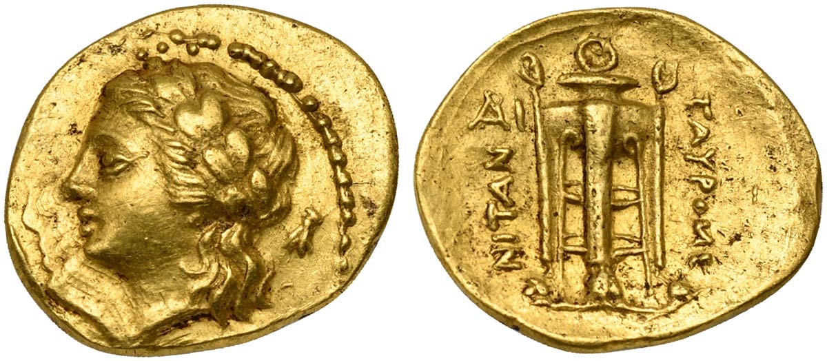 Sicily, Tauromenion, 15 Litrai, ca. 275-210 BC; AV (g 1,17; mm 12; h 12);...