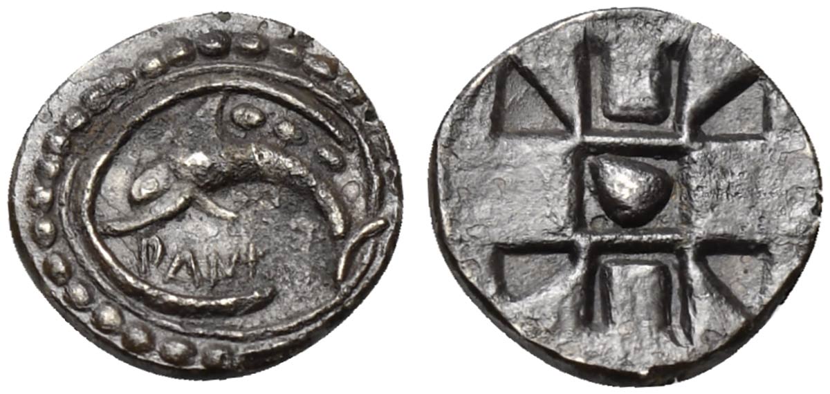 Sicily, Messana - Zankle under the Samians, Chalcidian Hemiobol, ca. 520-510 BC; AR (g 0,24; mm 7); DANKVE, dolphin leaping l.; above, three pellets; all within sickle-shaped band, Rv. Scallop shell on center of incuse key-pattern. Gielow –; Cf. SNG Fitzwilliam 1063 (litra).