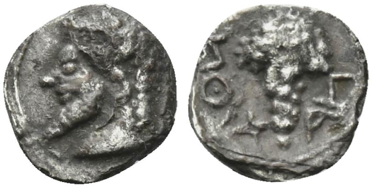 Sicily, Naxos, Litra, ca. 530-510 BC; AR (g 0,65; mm 10; h 4); Head of Dionysos l., wearing ivy wreath, Rv. NA - XION (retrograde), bunch of grape. Cahn pl. I, 21; Campana 2; SNG ANS 513.