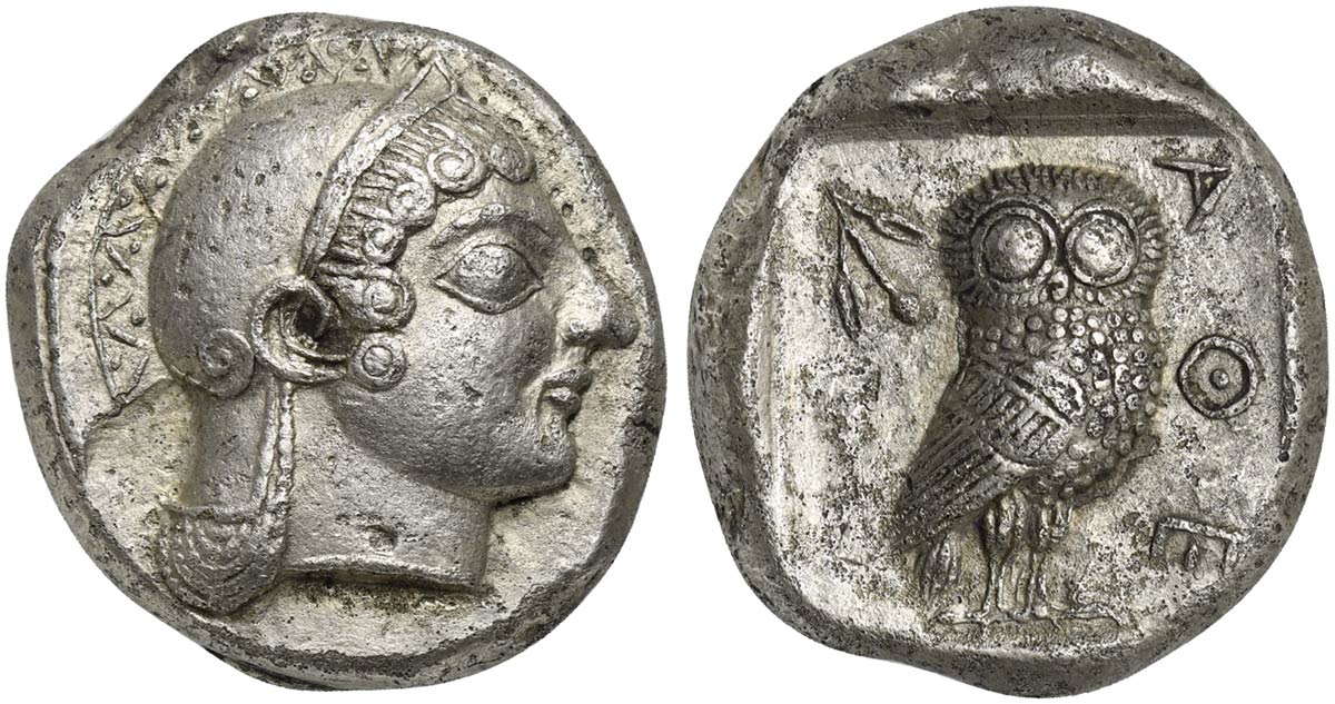 Attica, Athens, Tetradrachm, ca. 500-480 BC; AR (g 16,98; mm 22; h 6); Head of Athena r., wearing crested helmet decorated with chevron and dot pattern, Rv. AΘE, owl, with closed wings, standing r. with head facing; on l., olive twig with two leaves and one berry; all within incuse square. Seltman Group M & G; Asyut Group IV; HGC 1590.