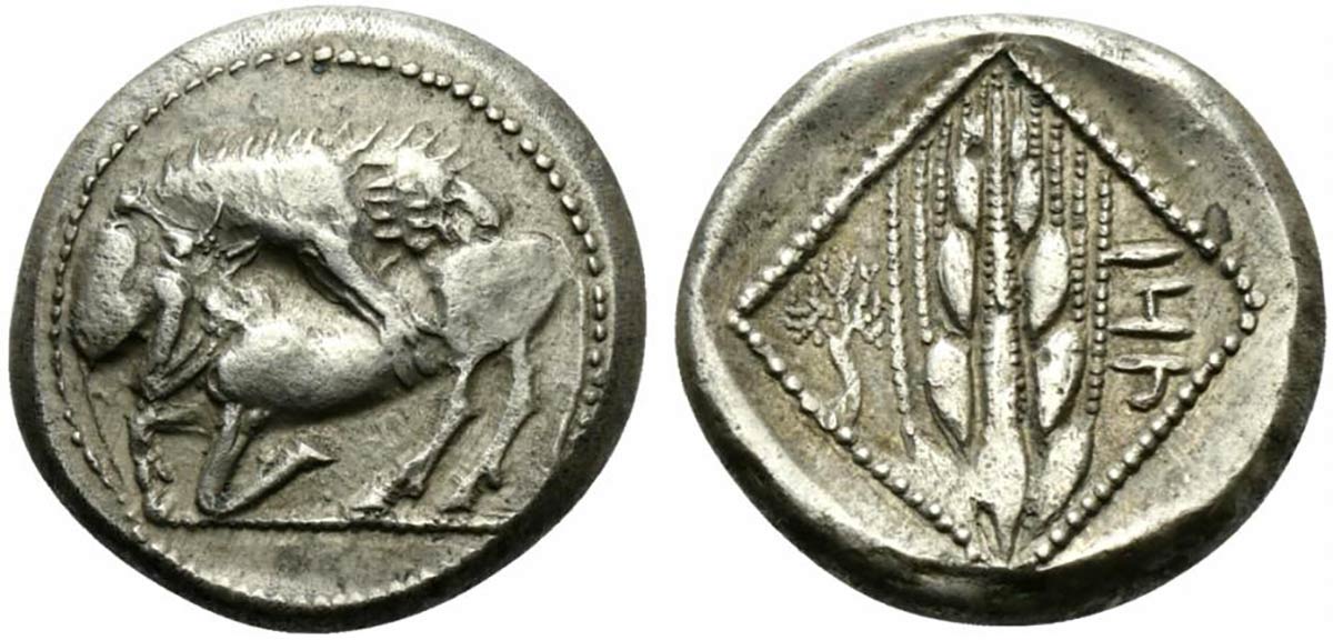 Cilicia, Tarsos, Stater, ca. 420-410 BC; AR (g 11,04; mm 21; h 8); Lion r., attacking bull kneeling l., Rv. Grain ear; on l., little tree; on r. 'TRZ' in Aramaic; all within diamond-shaped linear border within shallow incuse circle. SNG France 201-202; SNG Levante 54 var.
