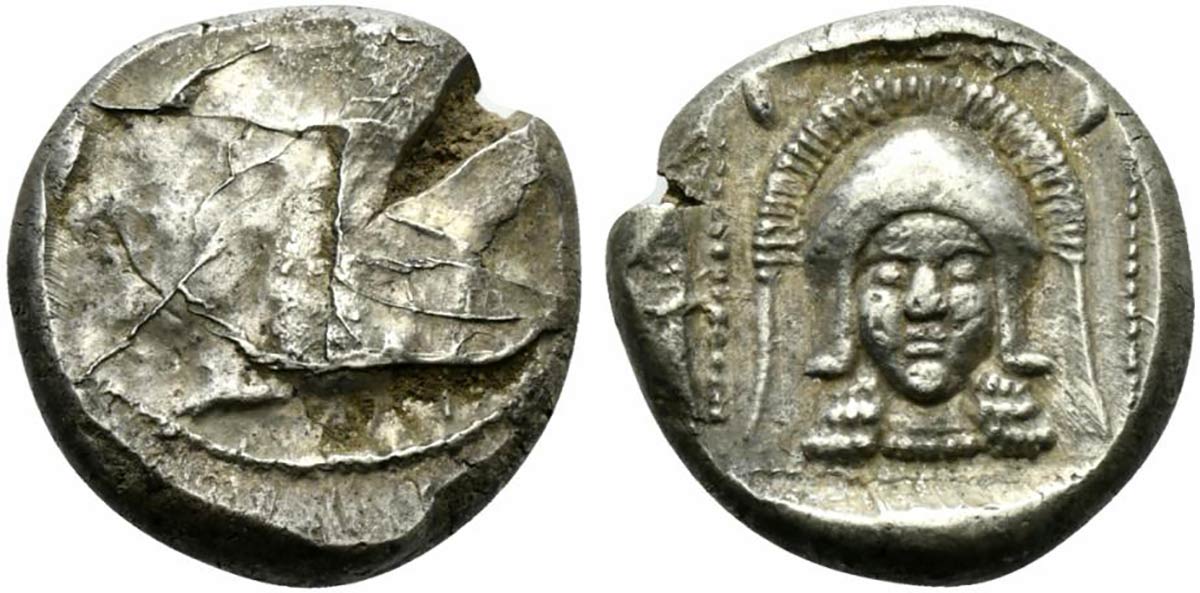 Cyprus, Lapethos, Stater, ca. 435 BC; AR (g 10,86; mm 20; h 2); Head of Athena l., wearing crested Corinthian helmet, Rv. Head of Athena facing, wearing open-faced helmet with transverse crest, and necklace; decorative elements in upper corners, all within dotted border within incuse square. Unpublished in the standard references, but cf. BMC 7-9, pl. VI, 6-8; Tziambazis cf. 48.