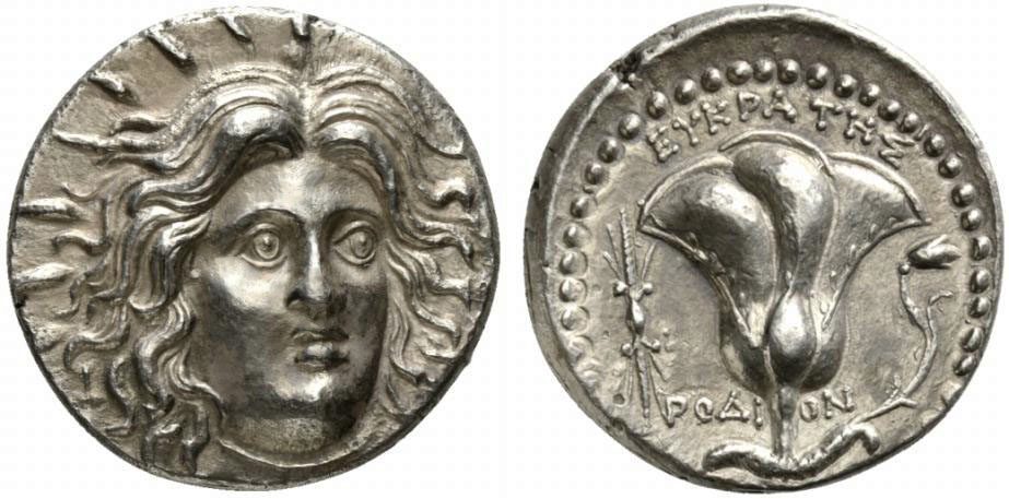 Islands of Caria, Rhodes, Tetradrachm struck under magistrate Eukrates, ca. 229-205 BC; AR (g 13,36; mm 25; h 12); Radiate head of Helios facing slightly r., Rv. Rose with bud to r.; above, EYKPATHΣ; below, POΔI - ON; on l., thunderbolt. Ashton 214; HGC 6, 1432.