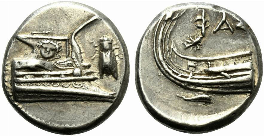 Lycia, Phaselis, Stater, 4th century BC; AR (g 10,27; mm 21; h 5); Prow of galley r., fighting platform decorated with facing gorgoneion; on r., cicada upward, Rv. Stern of galley l.; above, ΦAΣ; below, dolphin r. Heipp-Tamer Series 6.