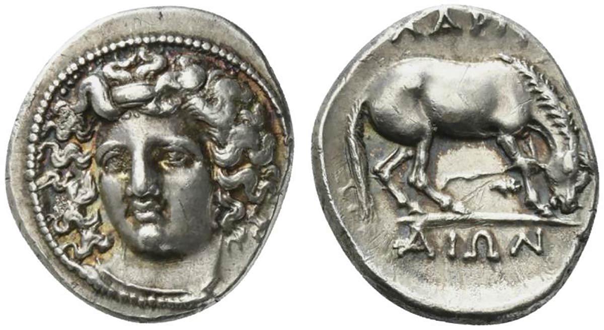 Thessaly, Larissa, Drachm, ca. 356-342 BC; AR (g 6,17; mm 20; h 6); Head of the nymph Larissa facing slightly l., with hair in ampyx, Rv. ΛΑΡΙΣ - ΑΙΩΝ, Horse to r., preparing to roll over. BCD Thessaly II 315–6.
