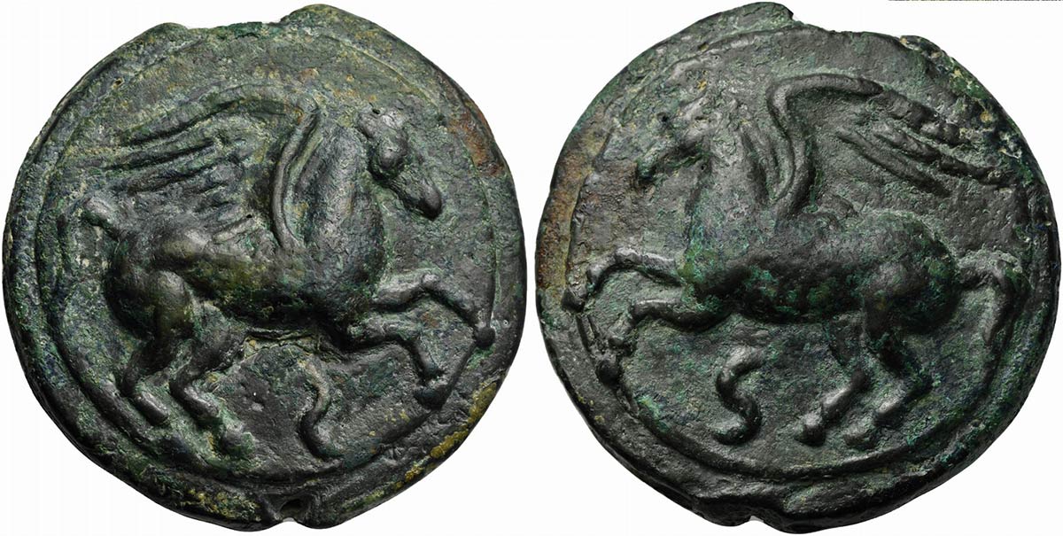 Roman Republic, Apollo/Apollo series, Cast Semis, Rome, ca. 270 BC; AE (g 161; mm 51; h 12); Pegasus flying r.; below, S, Rv. Same type l. Crawford 18/2; ICC 34.