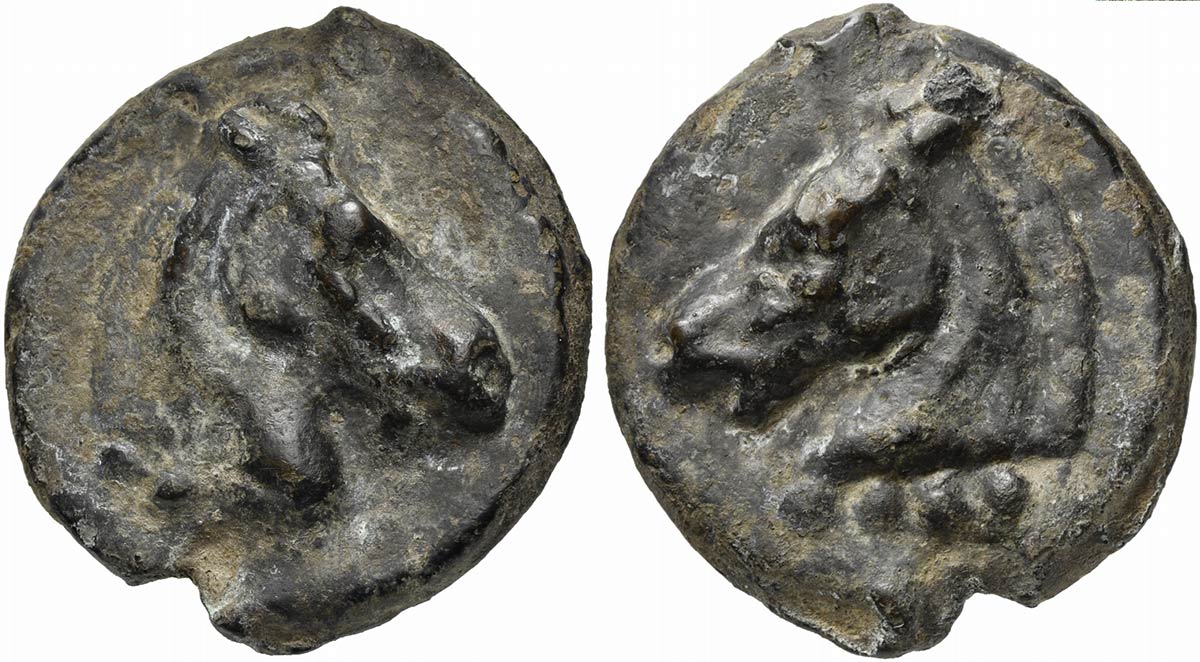 Roman Republic, Apollo/Apollo series, Cast Triens, Rome, ca. 270 BC; AE (g 112; mm 53; h 12); Head of horse r.; below, °°°°, Rv. Same type l. Crawford 18/3; ICC 35.