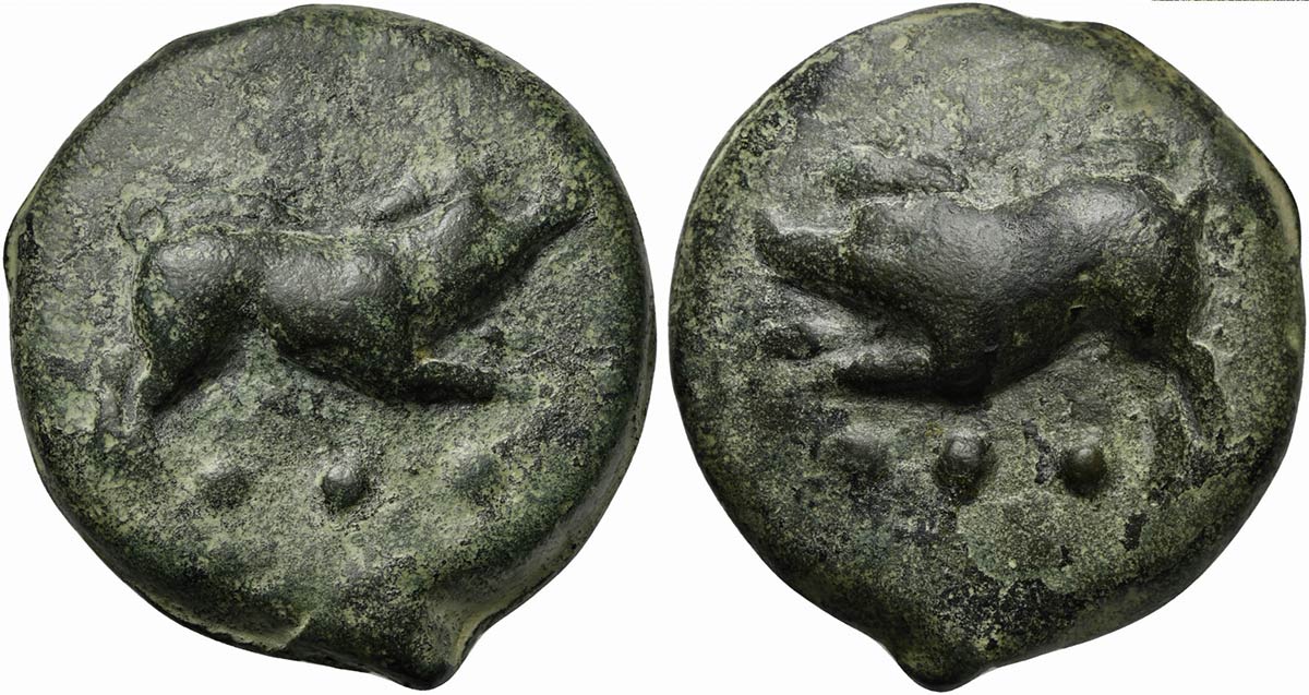 Roman Republic, Apollo/Apollo series, Cast Quadrans, Rome, ca. 270 BC; AE (g 90; mm 44; h 12); Boar leaping r.; below, °°°, Rv. Same type l. Crawford 18/4; ICC 36.