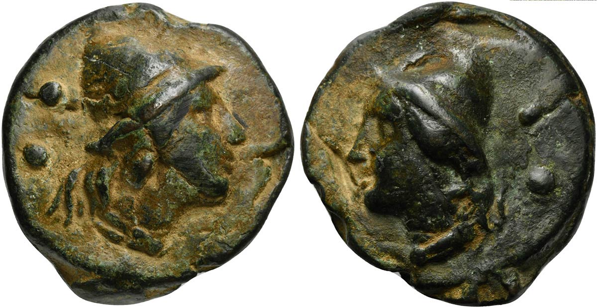 Roman Republic, Apollo/Apollo series, Cast Sextans, Rome, ca. 270 BC; AE (g 57; mm 37; h 12); Head of Dioscurus r., wearing pileus; behind, °°, Rv. Same type l. Crawford 18/5; ICC 37.