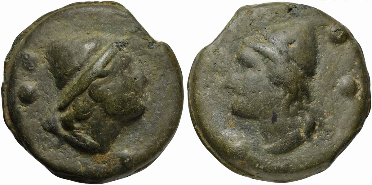 Roman Republic, Apollo/Apollo series, Cast Sextans, Rome, ca. 270 BC; AE (g 59; mm 37; h 12); Head of Dioscurus r., wearing pileus; behind, °°, Rv. Same type l. Crawford 18/5; ICC 37.