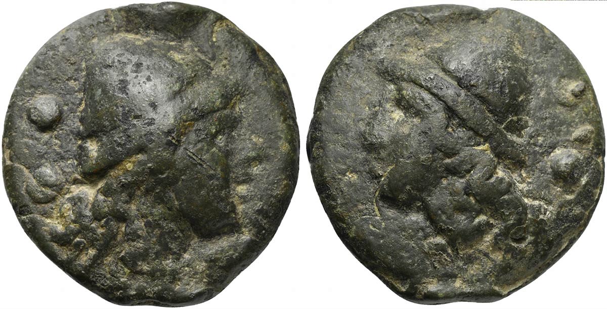 Roman Republic, Apollo/Apollo series, Cast Sextans, Rome, ca. 270 BC; AE (g 58; mm 34; h 12); Head of Dioscurus r., wearing pileus; behind, °°, Rv. Same type l. Crawford 18/5; ICC 37.