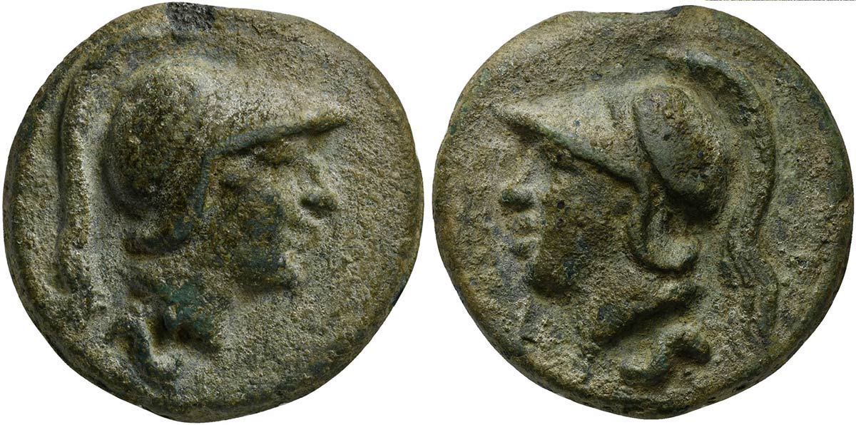 Roman Republic, Roma/Roma series, Cast Semis, Rome, ca. 265 BC; AE (g 127; mm 52; h 12); Head of Minerva r., wearing Corinthian helmet; below, S, Rv. Same type l. Crawford 21/2; ICC 42.