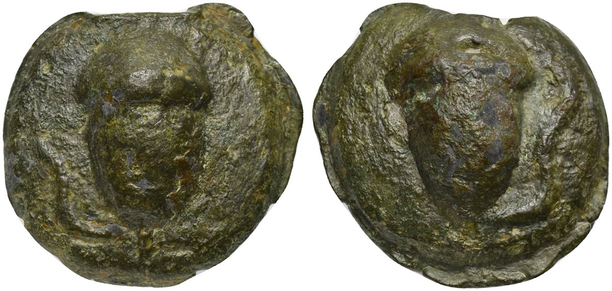 Roman Republic, Roma/Roma series, Cast Semuncia, Rome, ca. 265 BC; AE (g 14; mm 22; h 12); Acorn; beside, S, Rv. Same type. Crawford 21/7; ICC 47.