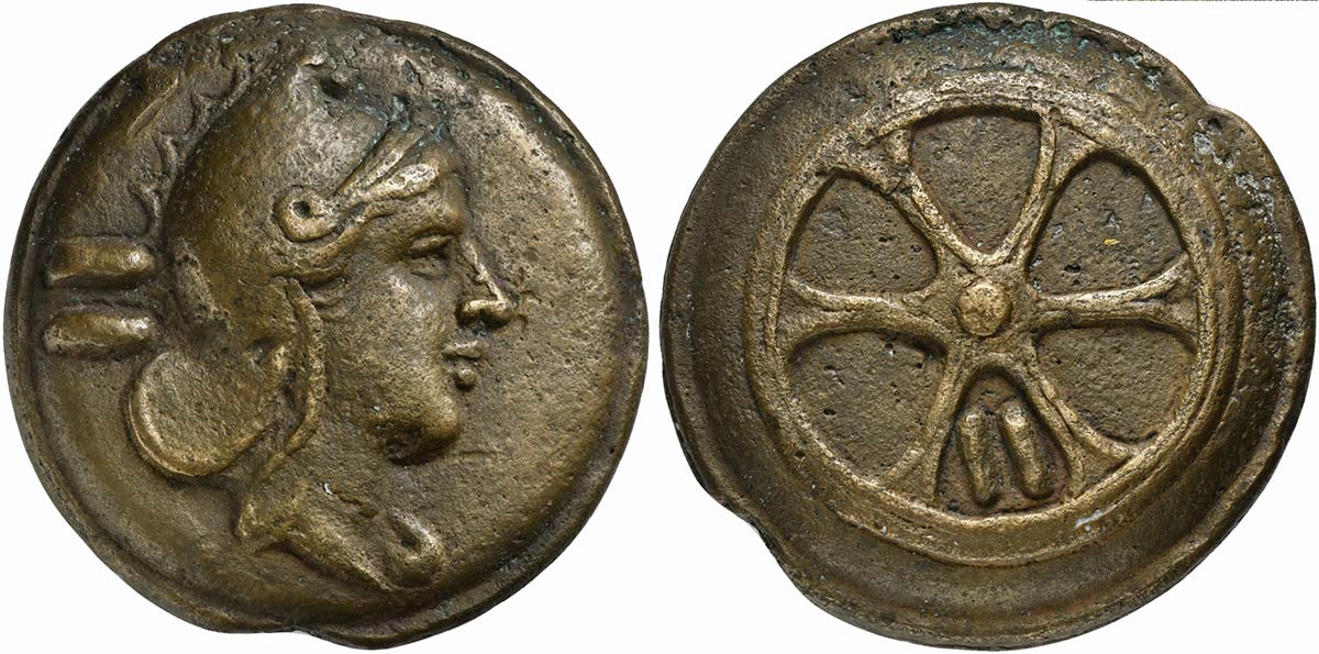 Roman Republic, Whell series, Cast Dupondius, Rome, ca. 230 BC; AE (g 608; mm 80); Head of Roma r., wearing Phrygian helmet with pinnate crest; behind, II, Rv. Wheel of six spokes; between two spokes, II. Crawford 24/2; ICC 65.