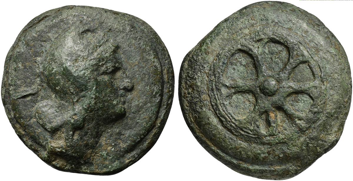Roman Republic, Whell series, Cast As, Rome, ca. 230 BC; AE (g 301; mm 61); Head of Roma r., wearing Phrygian helmet with pinnate crest; behind, I, Rv. Wheel of six spokes; between two spokes, I. Crawford 24/3; ICC 66.