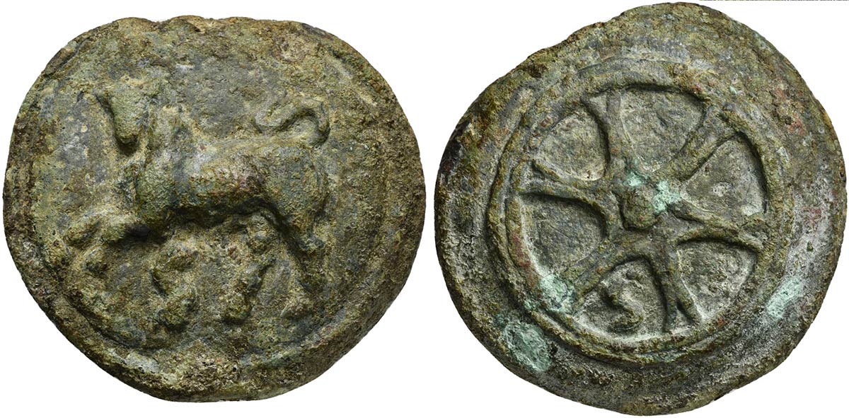 Roman Republic, Whell series, Cast Semis, Rome, ca. 230 BC; AE (g 133; mm 51); Bull leaping l.; below, S, Rv. Wheel of six spokes; between two spokes, S. Crawford 24/4; ICC 67.