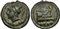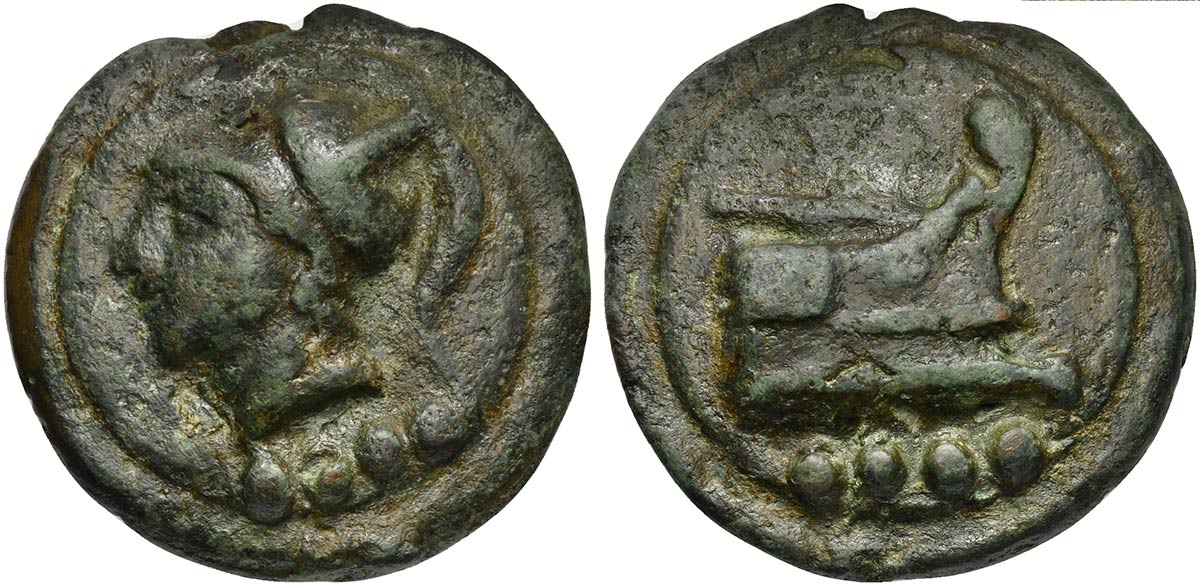 Roman Republic, Janus/Prow to r. series, Cast Triens, Rome, ca. 225-217 BC; AE (g 79; mm 45; h 12); Head of Minerva l., wearing Corinthian helmet; below °°°°, Rv. Prow r.; below, °°°°. Crawford 35/3a; ICC 78.