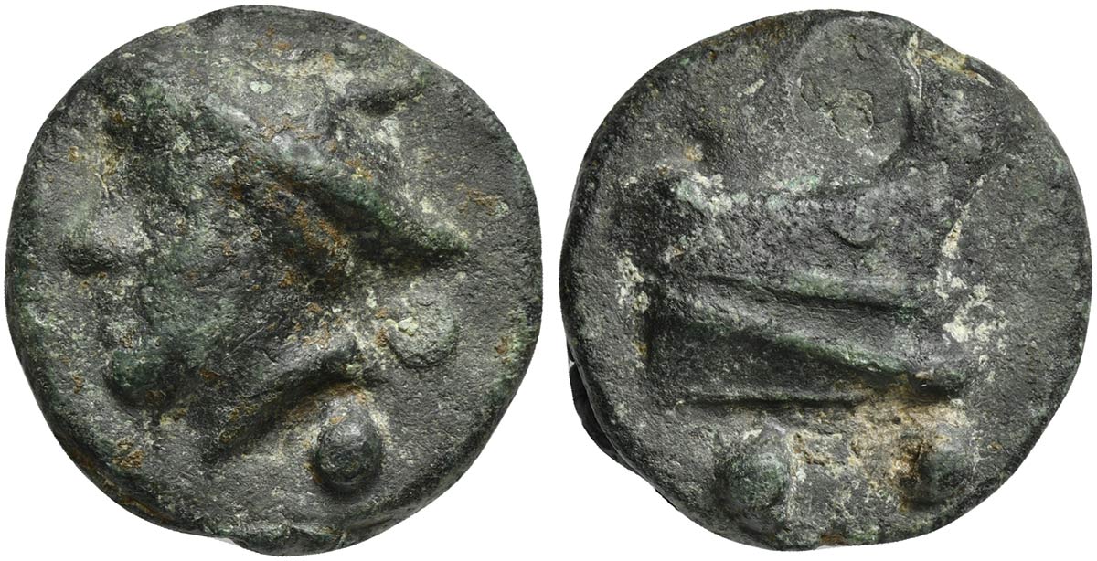 Roman Republic, Janus/Prow to r. series, Cast Sextans, Rome, ca. 225-217 BC; AE (g 41; mm 33; h 12); Head of Mercury l., wearing winged petasus; below, °°, Rv. Prow r.; below, °°. Crawford 35/5; ICC 82.