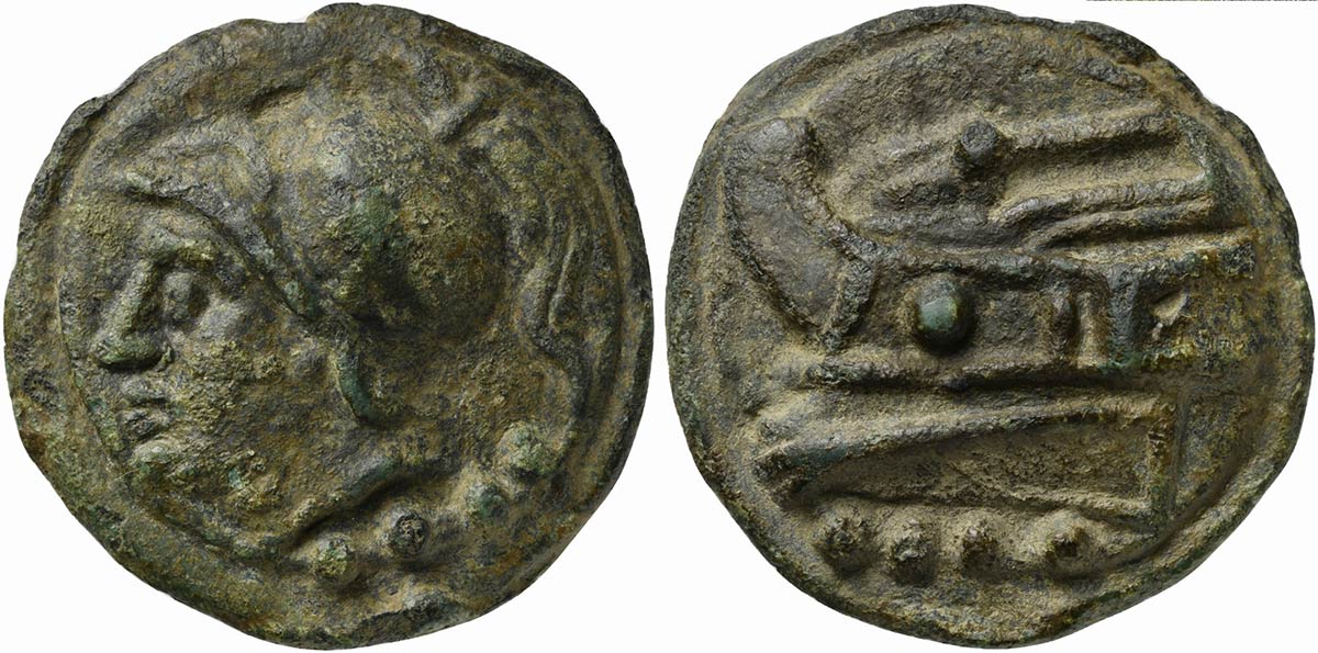 Roman Republic, Semilibral series, Cast Triens, Rome, ca. 217-215 BC; AE (g 53; mm 40; h 12); Head of Minerva l., wearing Corinthian helmet; below °°°°, Rv. Prow l.; below, °°°°. Crawford 38/3; ICC 95.