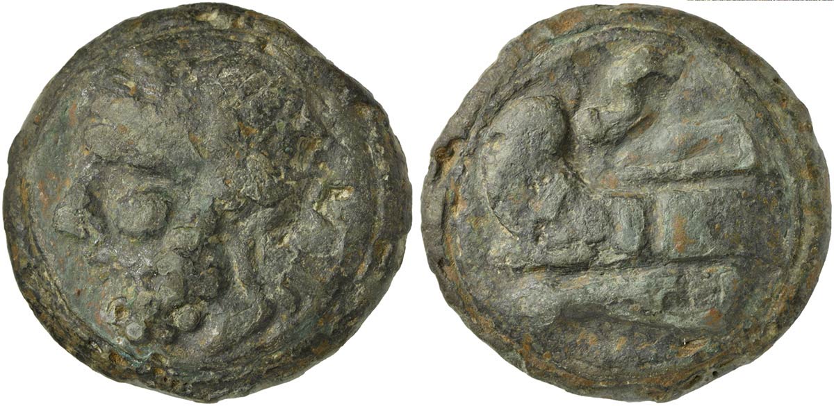 Roman Republic, Post-semilibral series, Cast Semis, Rome, ca. 215-212 BC; AE (g 41; mm 34; h 12); Laureate head of Saturn l.; behind, S, Rv. Prow l.; above, S. Crawford 41/6a; ICC 107.