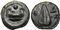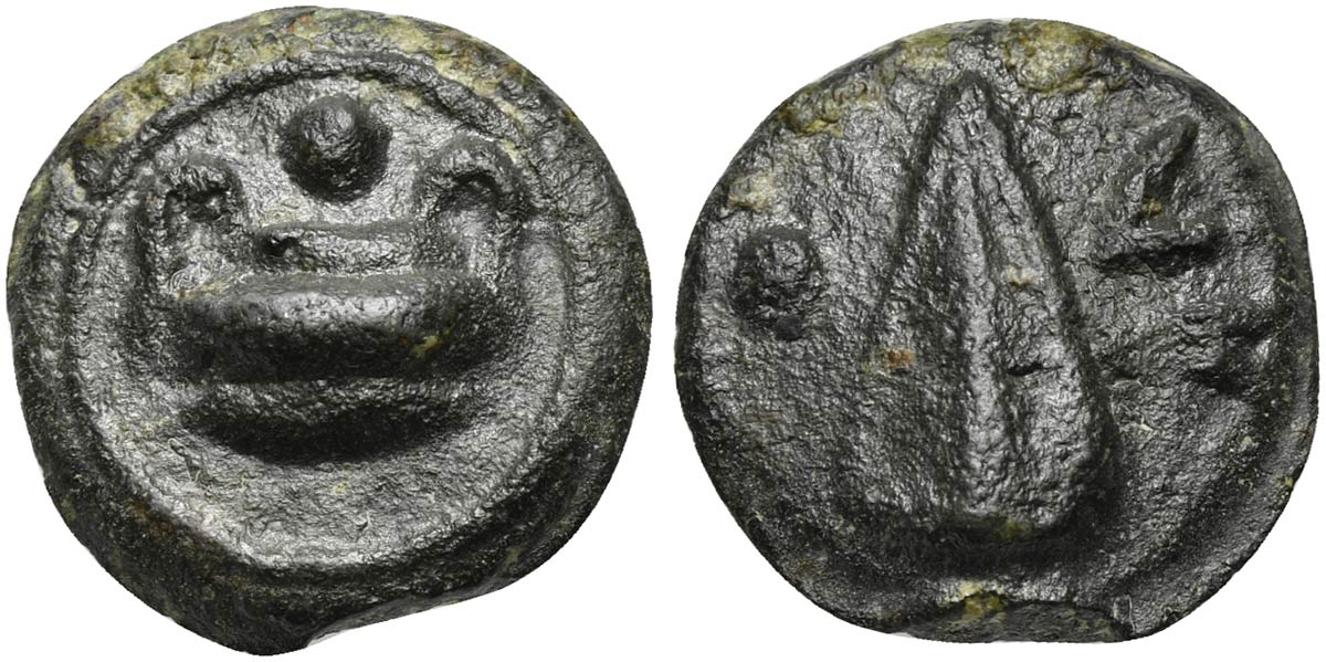 Umbria, Cast Uncia, Tuder, ca. 220-200 BC; AE (g 8; mm 19; h 12); Squat kantharos; above, °, Rv. Spearhead; around, TV and °. HNItaly 50; ICC 227.