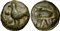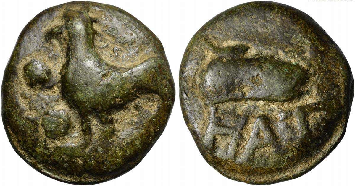 Picenum, Cast Biunx, Hatria, ca. 275-225 BC; AE (g 51; mm 37; h 6); Cock standing l.; before, °°, Rv. Shoe; below, HAT. HNItaly 15; ICC 240.