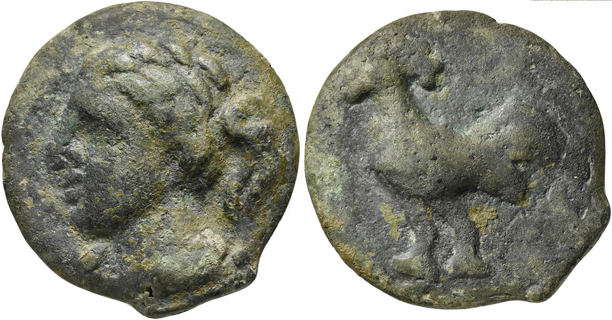 Apulia, Cast Nummus, Luceria, ca. 225-217 BC; AE (g 211; mm 66; h 2); Head...
