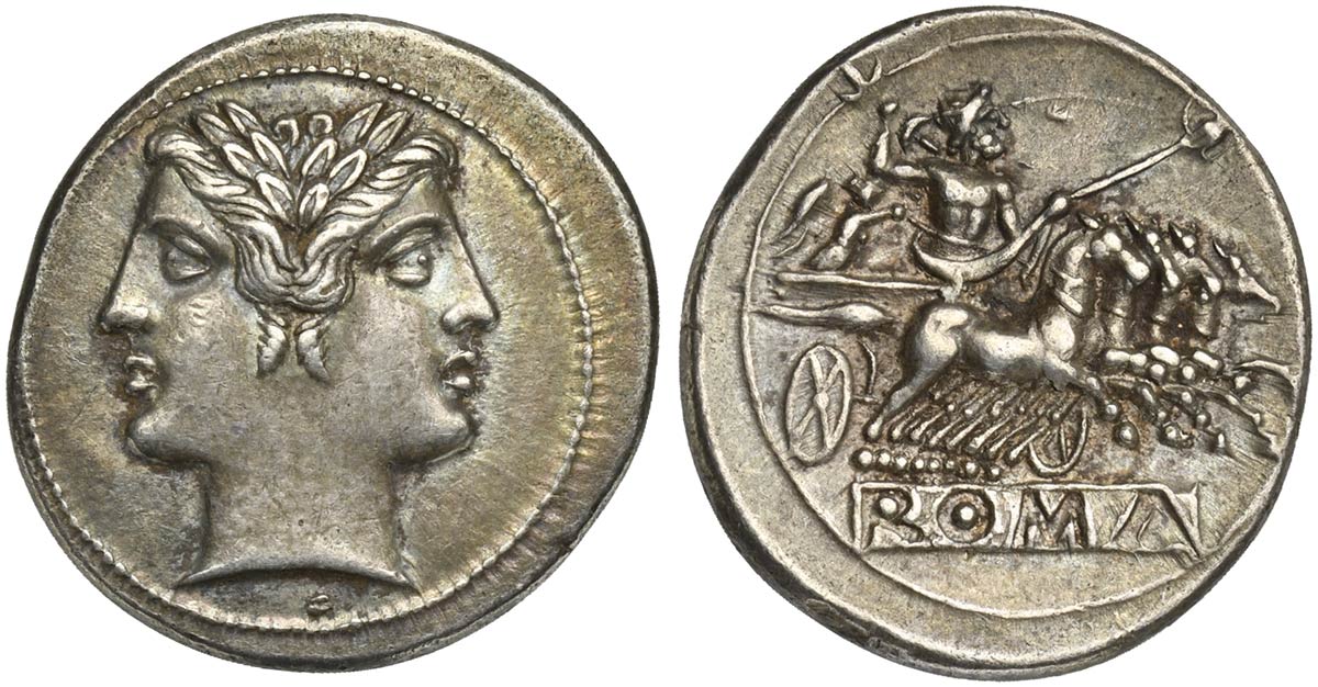 Anonymous, Quadrigatus, Rome, ca. 225-212 BC; AR (g 6,64; mm 23; h 4); Laureate Janiform head of Dioscuri, Rv. Jupiter in quadriga driven by Victory r., holding sceptre and thunderbolt; in ex. ROMA incuse on raised tablet. Crawford 28/3; Sydenham 64.