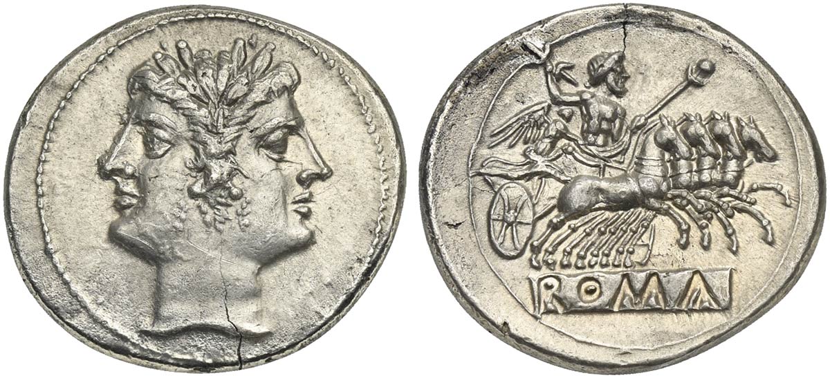 Anonymous, Quadrigatus, Rome, ca. 225-214 BC; AR (g 6,77; mm 23; h 6); Laureate Janiform head of Dioscuri, Rv. Jupiter in quadriga driven by Victory r., holding sceptre and thunderbolt; in ex. ROMA incuse on raised tablet. Crawford 30/1; Sydenham 64.