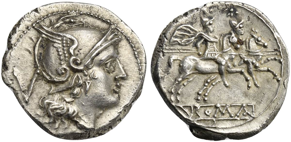 Lotto 203 | Anonymous, Quinarius, Rome, ca. 211-208 BC; AR (g 2,05; mm 15; h 9); Helmeted...