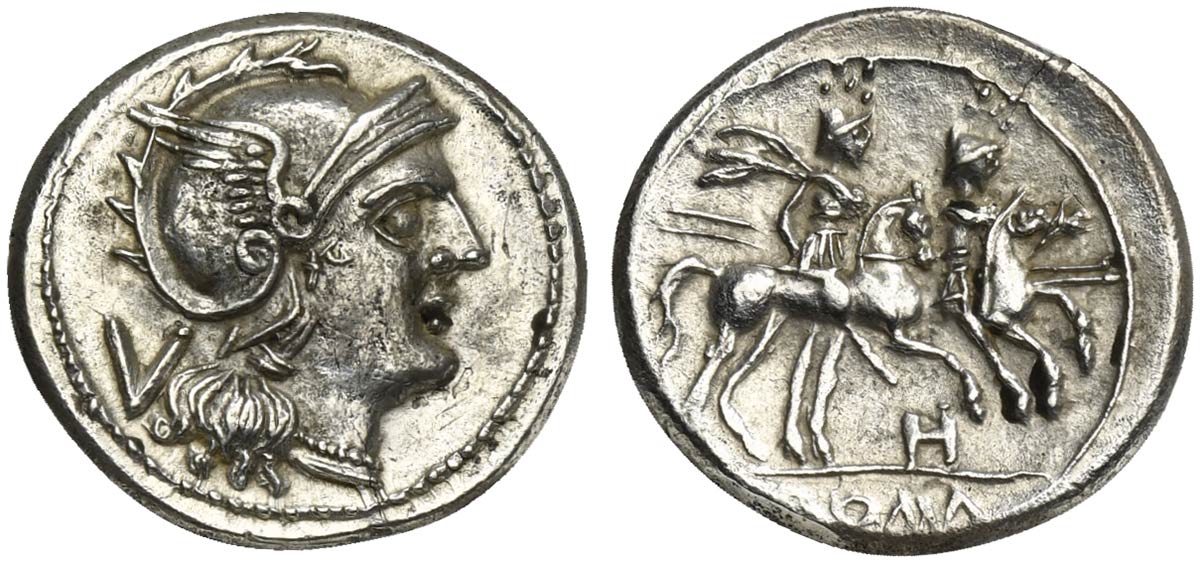 H series, Quinarius, South-East Italy, ca. 211-210 BC; AR (g 2,21; mm 16; h 6); Helmeted head of Roma r.; behind, V, Rv. Dioscuri galloping r.; below, H; in ex. ROMA. Crawford 85/1a; Sydenham 174.