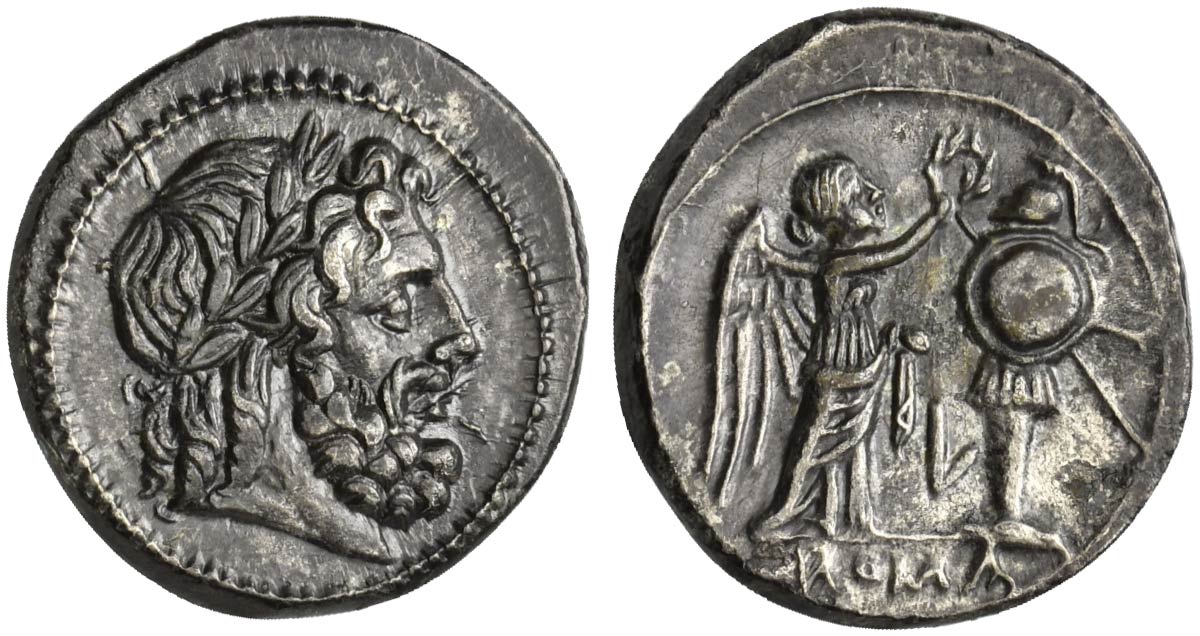 L series, Victoriatus, Luceria, ca. 214-208 BC; AR (g 3,24; mm 17; h 8); Laureate head of Jupiter r., Rv. Victory crowning trophy; between, L; in ex. ROMA. Crawford 97/1c; Sydenham 121.